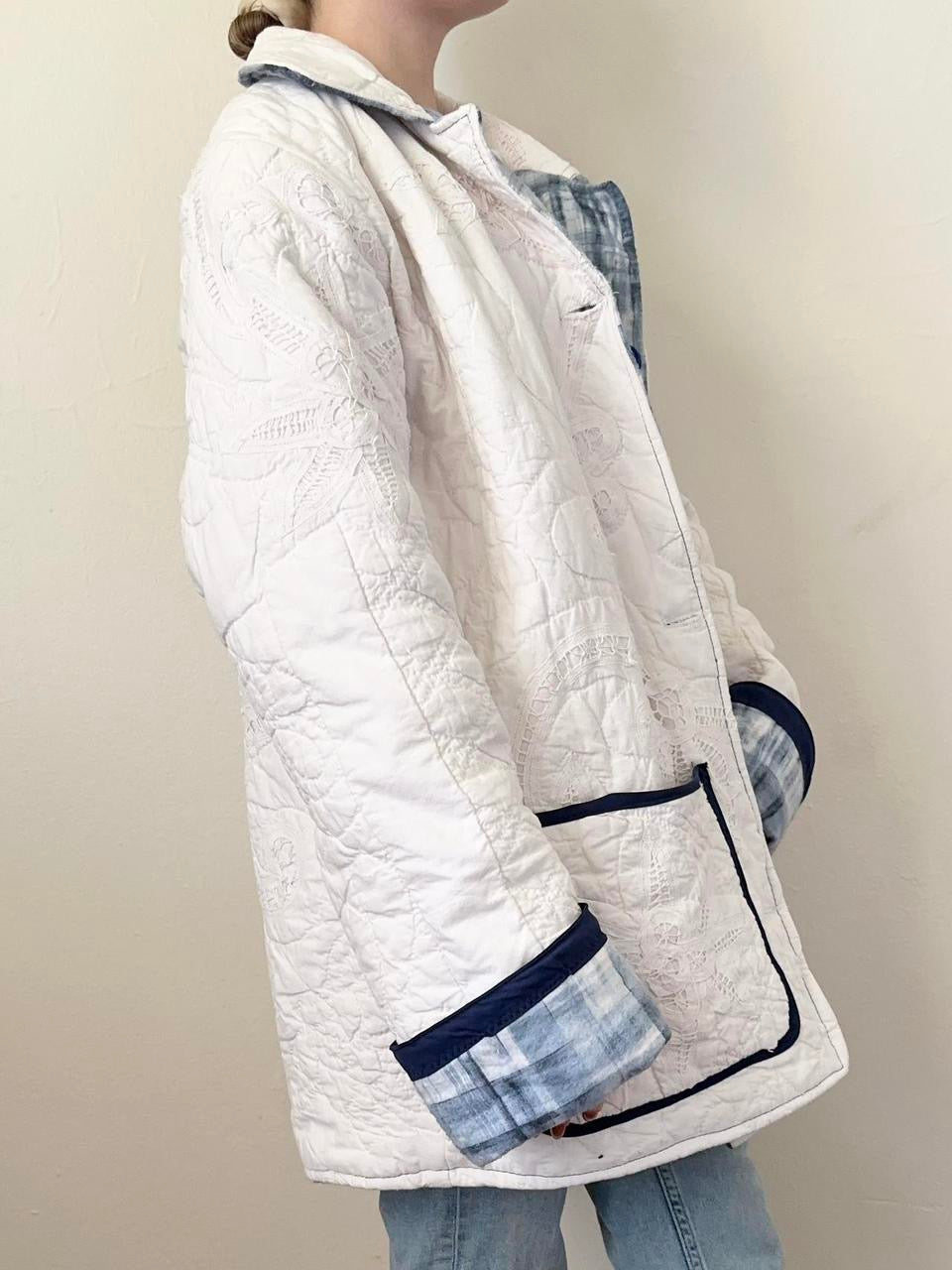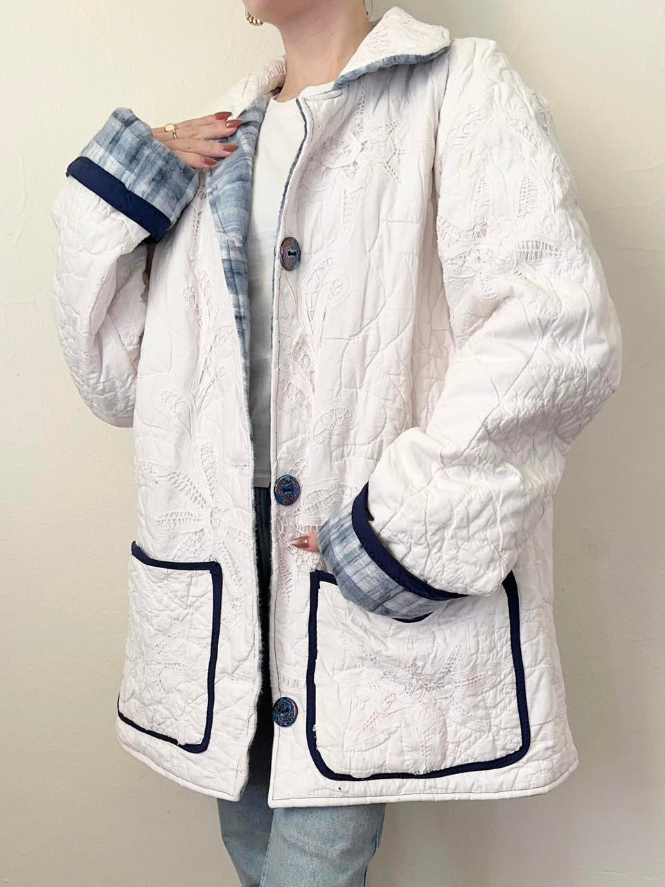 ♡ Details: This one-of-a-kind button down coat is upcycled from a vintage quilt! It is reversible; white quilted on one side and blue plaid fleece on the other side. So warm and cozy! This also features large front pockets and buttons on both sides.