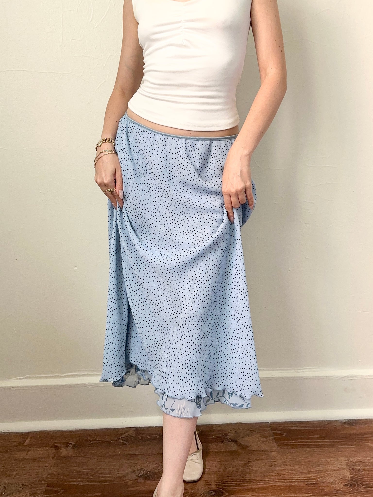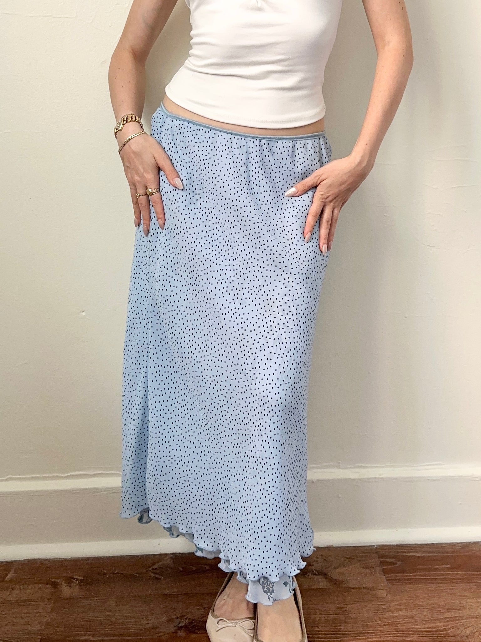 ♡ Details: This vintage Y2K skirt features a blue polka dot print on one side and a blue floral print on the other. This has a stretchy elastic waist.