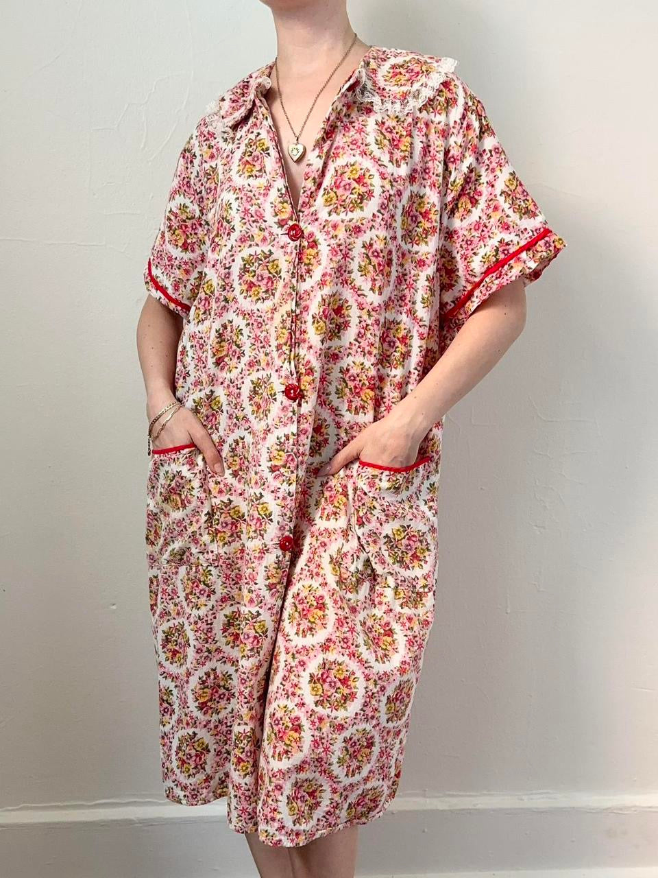 Vintage 1950s Retro Red Floral Cotton Dressing Robe Housecoat Nightgown